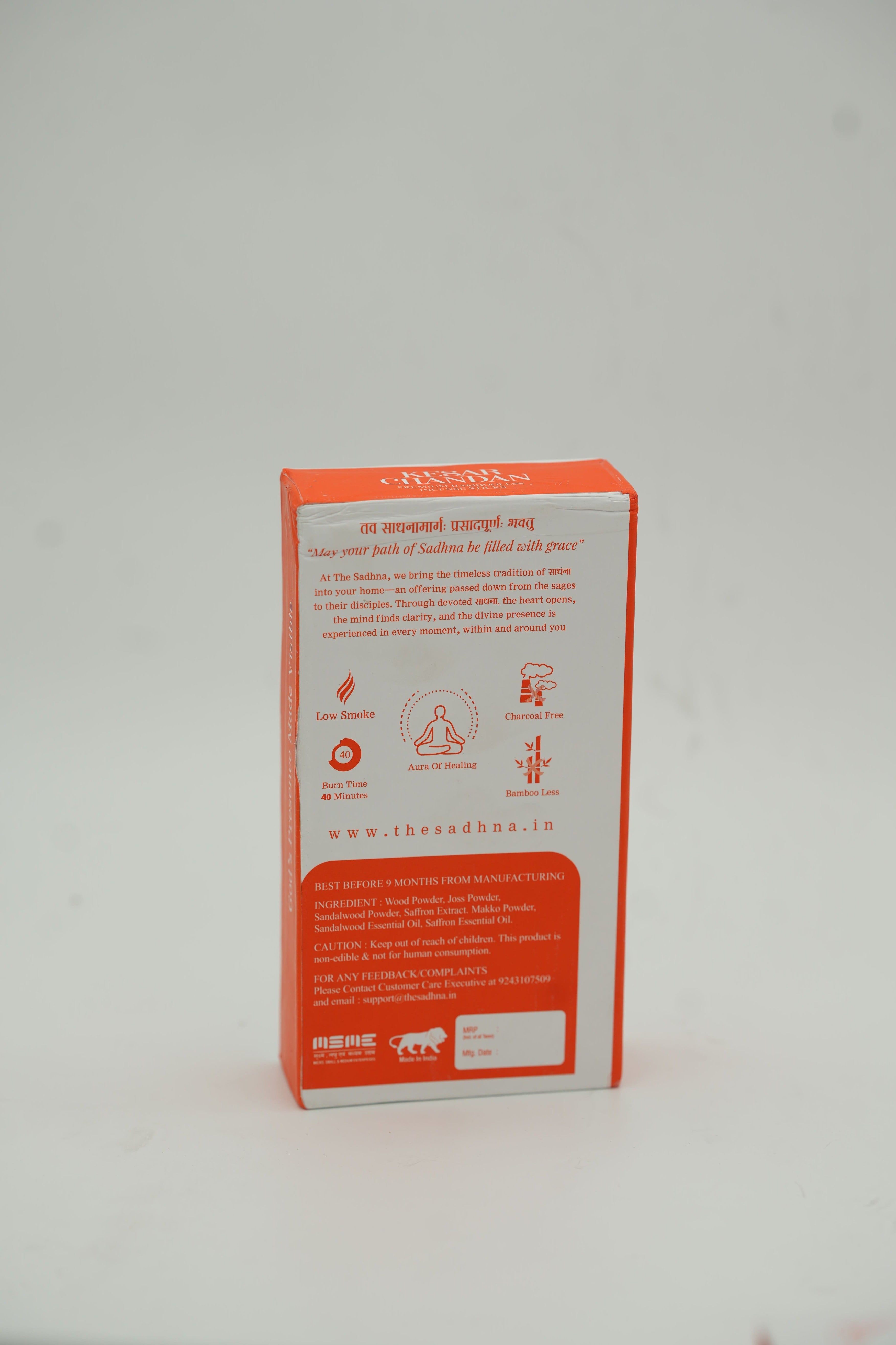 Kesar Chandan Bambooless Incense Sticks include 40 high-quality sticks, each 3.5 inches long. They burn cleanly for 30–35 minutes, releasing a pure Kesar Chandan fragrance without harsh smoke.